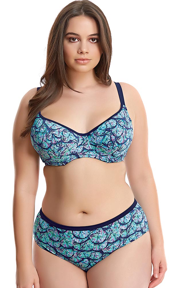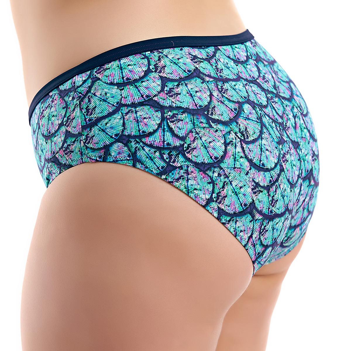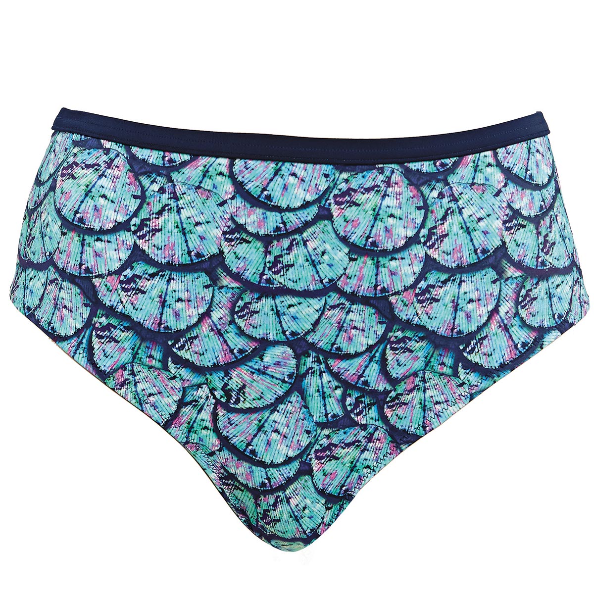 Klasyczne w kroju figi kąpielowe zachwycają przepięknym nadrukiem w kształcie muszelek. Granatowe kontury podkreślono turkusowymi i błękitnymi akcentami.