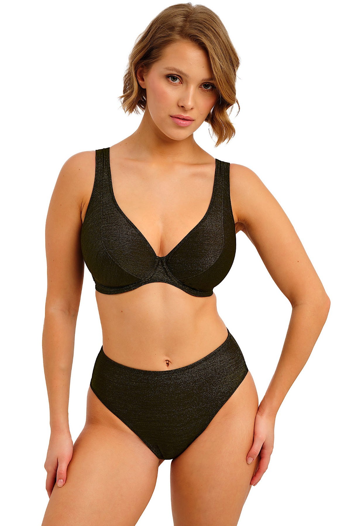 Biustonosz kąpielowy Arizona Waves High Apex z miękką miseczką na fiszbinie o kroju plunge (z niskim mostkiem) pięknie, ale nie nachalnie, eksponuje dekolt. Wydłużone miseczki przechodzące w ramiączka (w modnym stylu high apex) optycznie wysmuklają sylwetkę i dodają nietuzinkowego szyku. Piersi są uniesione i ładnie zebrane dzięki sprawdzonej konstrukcji miseczek z jednym pionowym cięciem. Stabilny pas obwodu zapewnia piersiom niezawodne podtrzymanie. Możliwość spięcia ramiączek na plecach ułatwi ich równomierne opalenie, a także dodatkową stabilizację piersi w czasie plażowych aktywności.