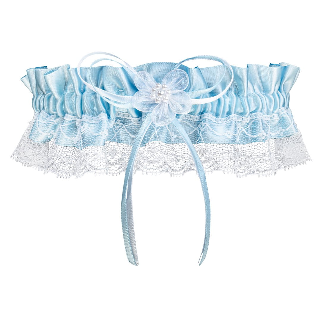 Dość szeroka, bogato zdobiona podwiązka Awinion spodoba się niejednej, wymagającej pannie młodej. Połączenie szerokiej, błękitnej taśmy z doszytą na dole, białą koronką prezentuje się doskonale, szczególnie w towarzystwie kokardki z tiulowym kwiatkiem i połyskliwym oczkiem.