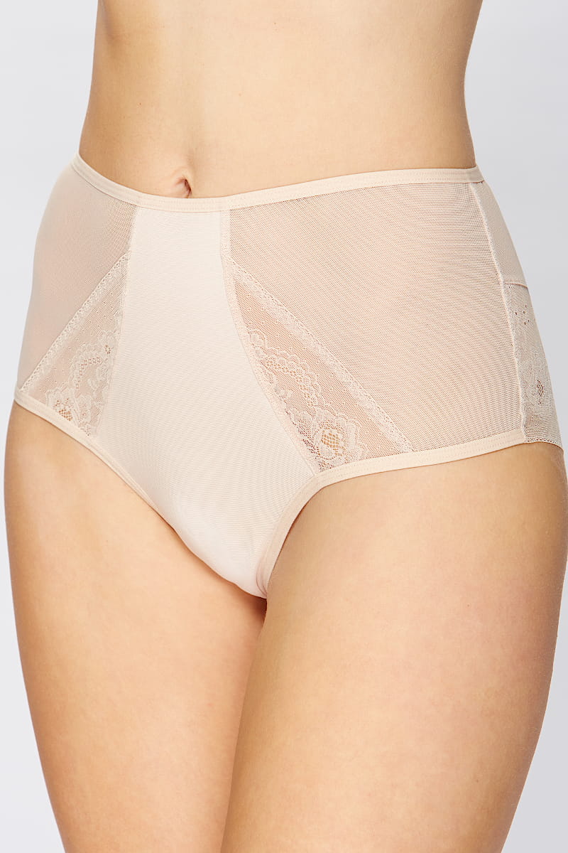 Klasyczne w formie figi z podwyższonym stanem wykonane z elastycznej siateczki. Przód fig ozdobiono wstawką z koronki o kwiatowym motywie. Koronka pojawia się również na tyle fig. W środku bawełniana wyściółka.