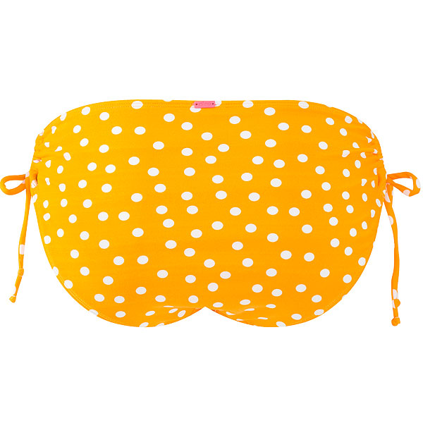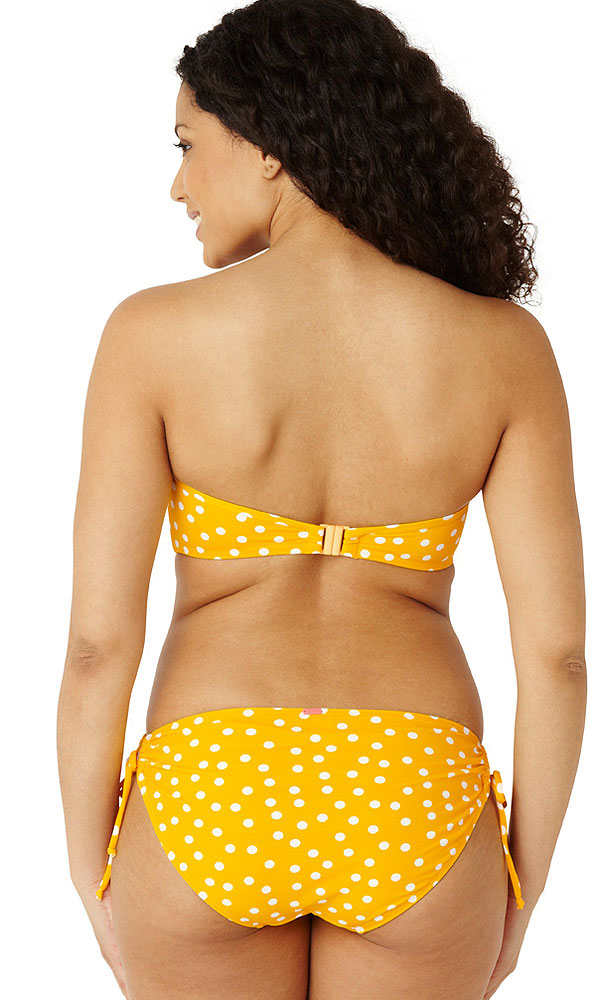 Figi kąpielowe Betty wykonano z żółtego materiału, zadrukowanego w białe groszki. Dzięki sznurowaniu po bokach można dopasować wysokość fig do indywidualnych potrzeb.