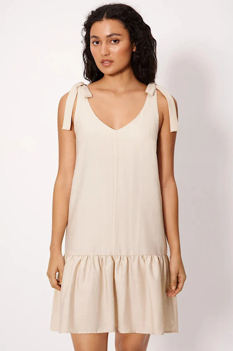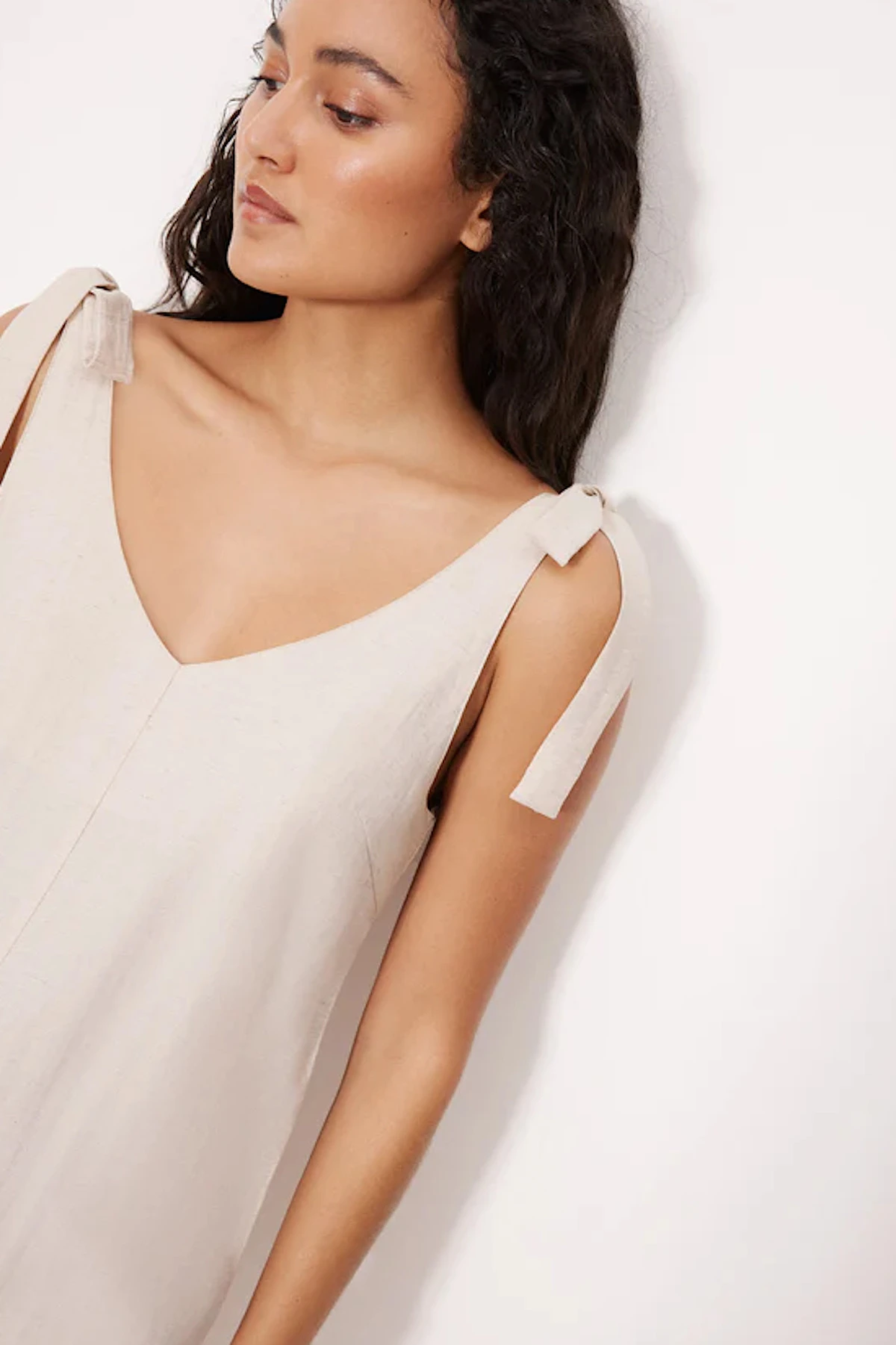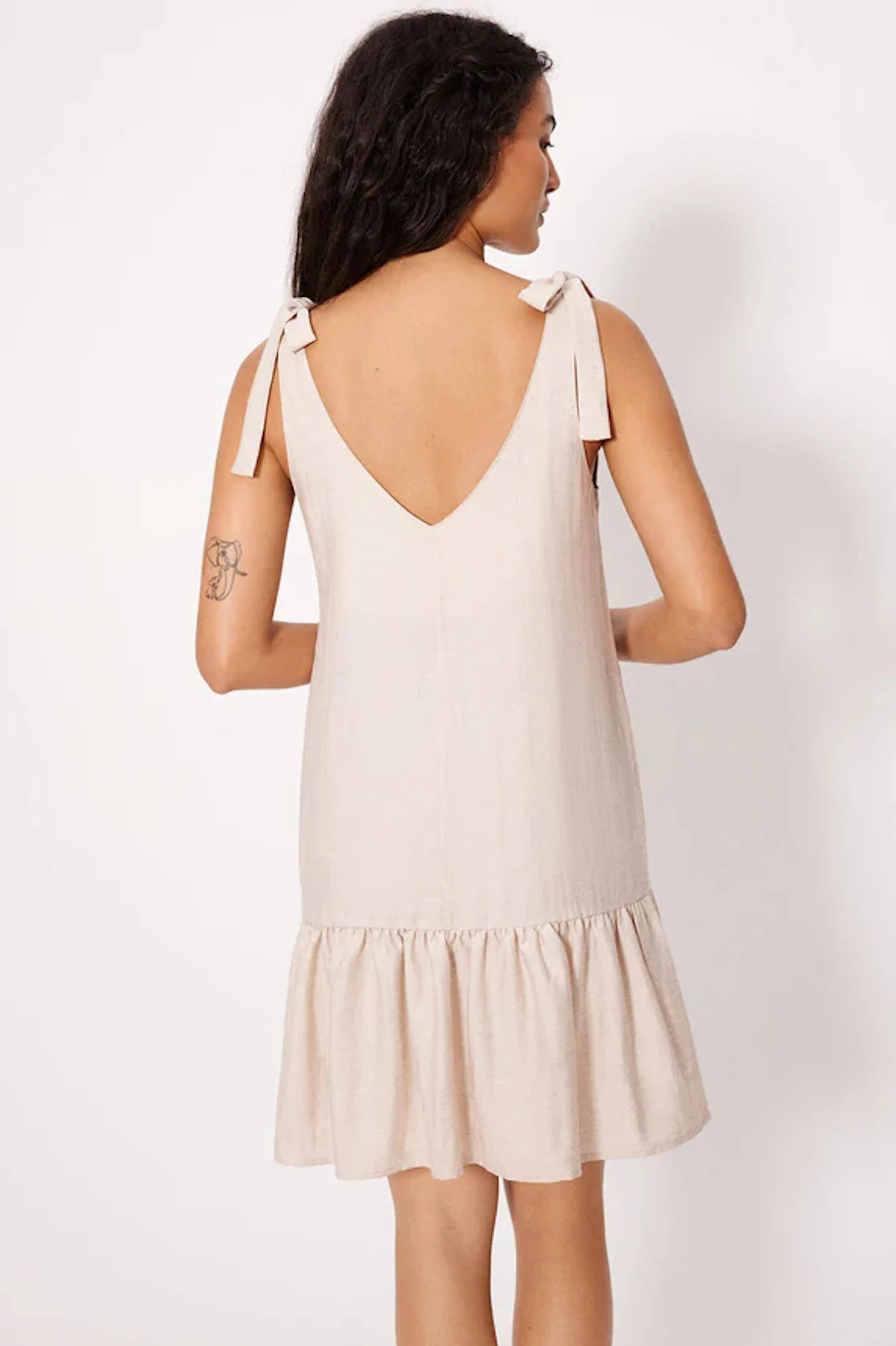Model Caleta to krótka sukienka plażowa z wiązanymi ramiączkami. Wykonana z mieszanki zawierającej 12% lnu, łączy w sobie przewiewność lnu z miękkością wiskozy. Wiązane ramiączka dają możliwość dopasowania sukienki do różnych wysokości i preferencji stylu. Model o luźnym fasonie.
