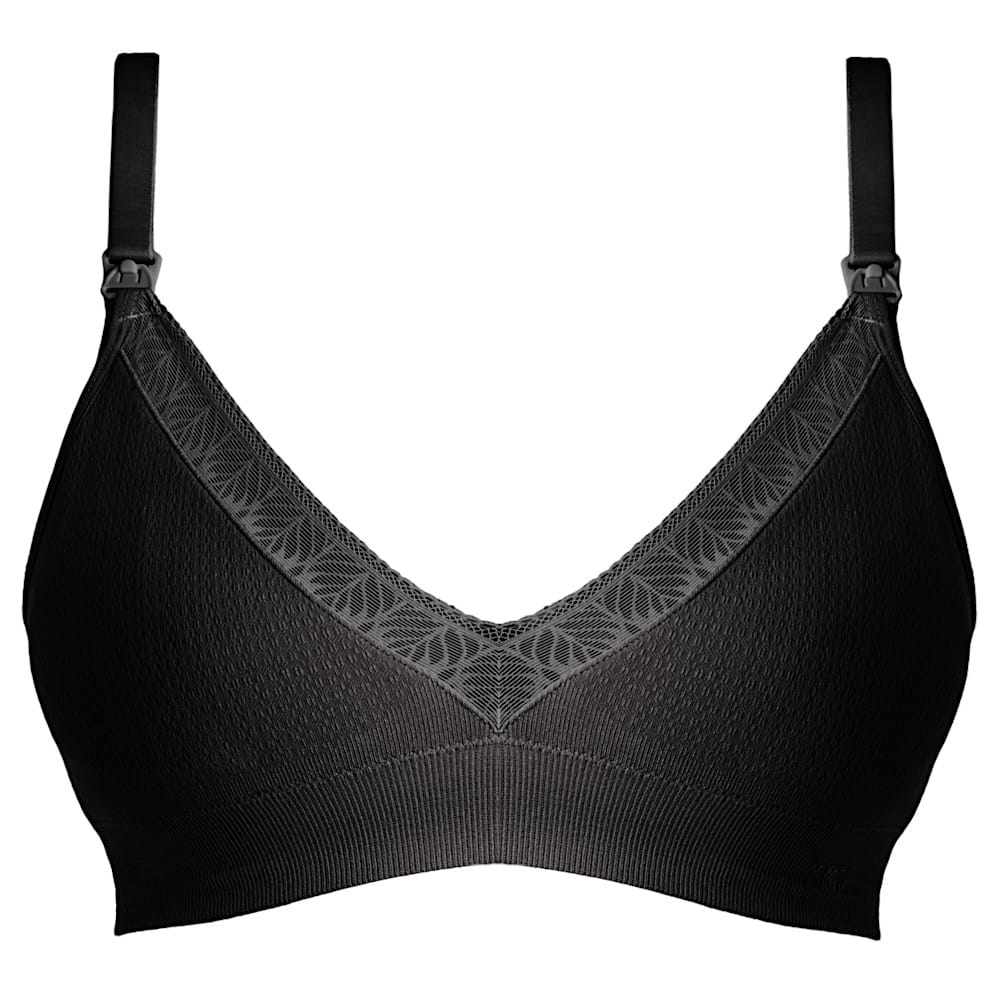 Biustonosz Caress Multifit to bezfiszbinowy biustonosz w całości dziany, niemal pozbawiony szwów. Miseczki uszyte są z wiskozy bambusowej oraz warstwy koronki z haftem w stylu art deco. Dzięki zastosowaniu wysokiej jakości włókien i wyjątkowo mocnych splotów o różnych rozciągliwościach, Caress Multifit jest w stanie podtrzymać i delikatnie wymodelować wypełnione mlekiem piersi - w sam raz na noc lub spokojny dzień w domu. Dodatkowymi elementami podnoszącymi stabilizację są lekkie, wyjmowalne piankowe wkładki w miseczkach oraz szeroka guma poprowadzona wewnątrz biustonosza wzdłuż dolnej krawędzi obwodu.