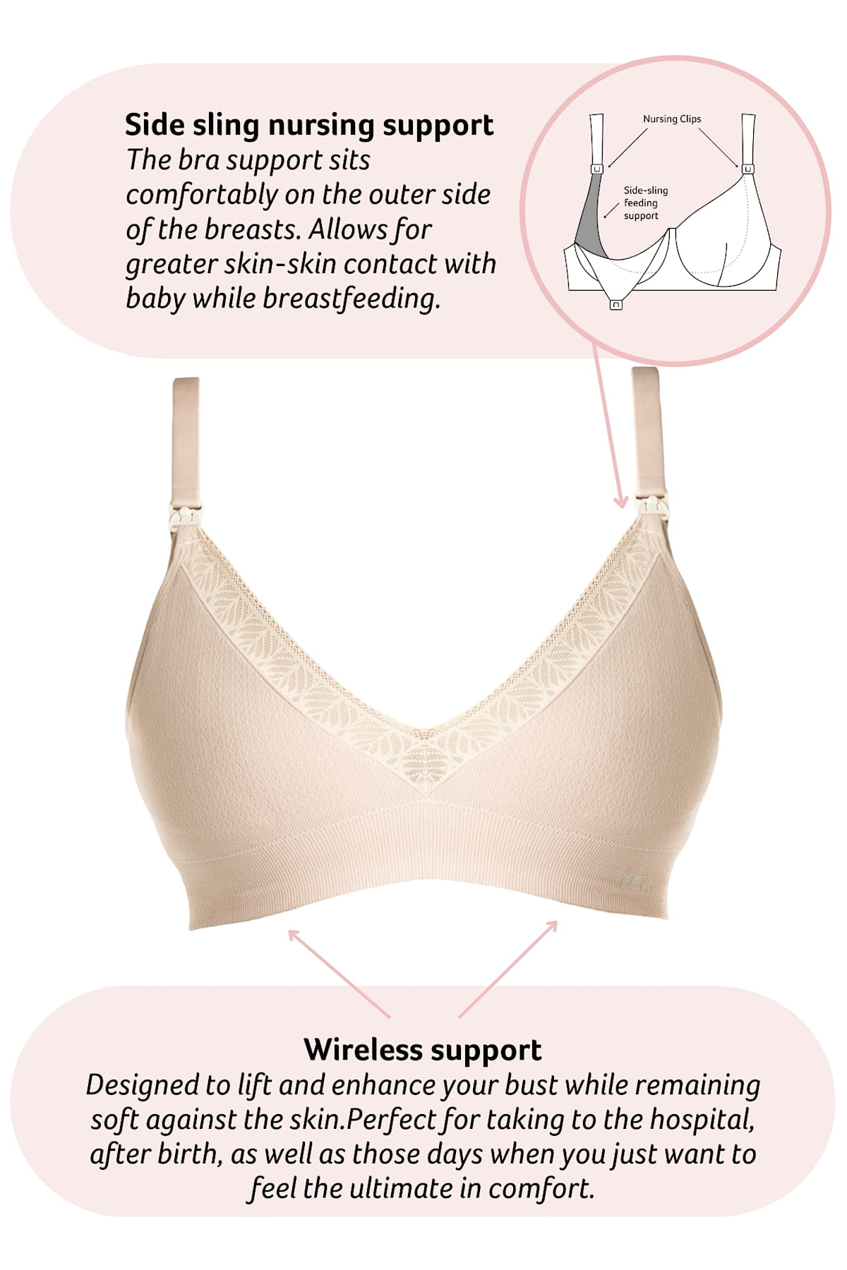 Miseczki są odpinane przy pomocy plastikowych klipsów. Ramiączka są zabezpieczone przed odskakiwaniem na plecy specjalnym klinem z dzianiny wszytym wewnątrz miseczki. Sześciostopniowa regulacja zapięcia i regulowane ramiączka pozwalają dopasować biustonosz do zmieniającego się ciała.