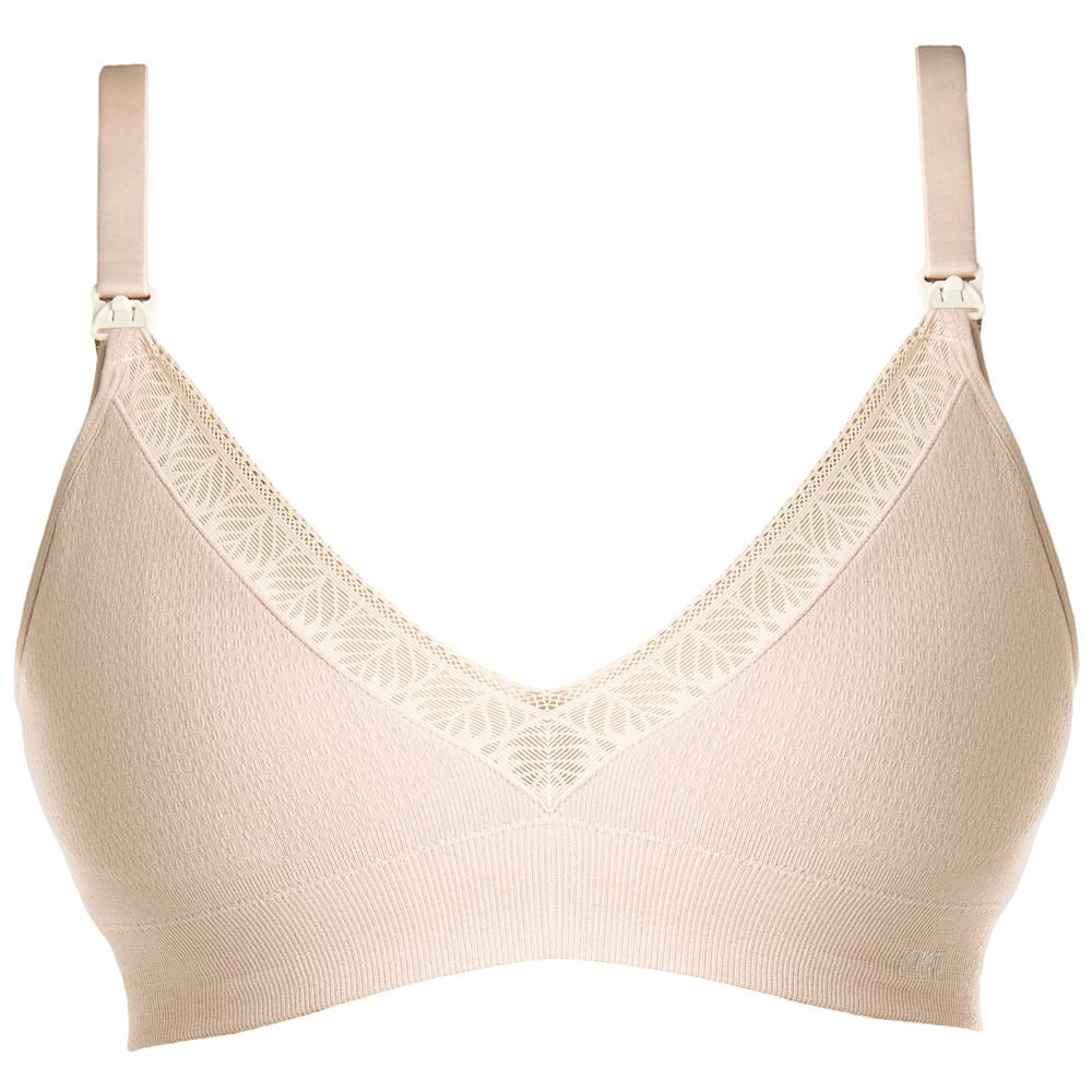 Biustonosz Caress Multifit to bezfiszbinowy biustonosz w całości dziany, niemal pozbawiony szwów. Miseczki uszyte są z wiskozy bambusowej oraz warstwy koronki z haftem w stylu art deco. Dzięki zastosowaniu wysokiej jakości włókien i wyjątkowo mocnych splotów o różnych rozciągliwościach, Caress Multifit jest w stanie podtrzymać i delikatnie wymodelować wypełnione mlekiem piersi - w sam raz na noc lub spokojny dzień w domu. Dodatkowymi elementami podnoszącymi stabilizację są lekkie, wyjmowalne piankowe wkładki w miseczkach oraz szeroka guma poprowadzona wewnątrz biustonosza wzdłuż dolnej krawędzi obwodu.