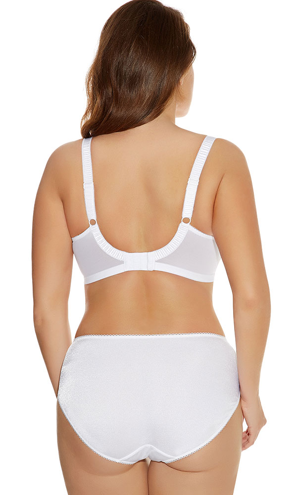 Biustonosz Cate to elegancka propozycja dla krąglejszych miłośniczek pięknej bielizny. Biustonosz został wykonany z satynowego materiału w klasycznej bieli. Górna część miseczek wykonana jest z półprzezroczystej siateczki z geometrycznym haftem. Mostek oraz nasadę ramiączek udekorowano malutkimi kokardkami.