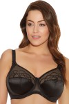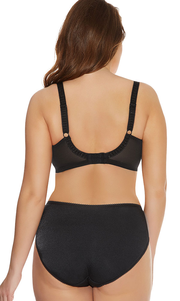 Biustonosz Cate to elegancka propozycja dla krąglejszych miłośniczek pięknej bielizny. Biustonosz został wykonany z satynowego materiału w głębokim odcieniu czerni. Górna część miseczek wykonana jest z półprzezroczystej siateczki z geometrycznym haftem. Mostek oraz nasadę ramiączek udekorowano malutkimi kokardkami.
