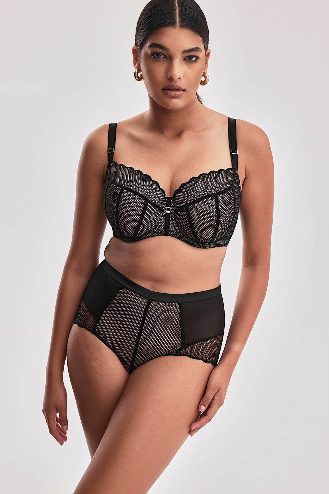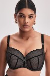 Biustonosz półusztywniony (semi-soft), dedykowany dla średniego i dużego biustu, wykonany z czarnego, elastycznego plenu oraz nowoczesnej koronki.