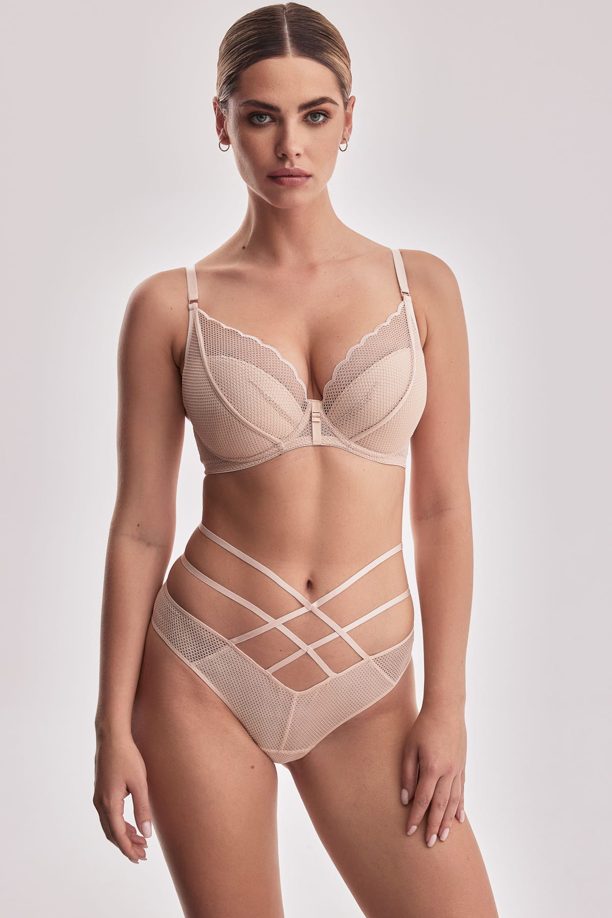 Wyjątkowe stringi wykonane z przepięknej koronki w neutralnym kolorze nude z eleganckimi paseczkami. W środku posiadają wyściółkę w 100% bawełnianą.