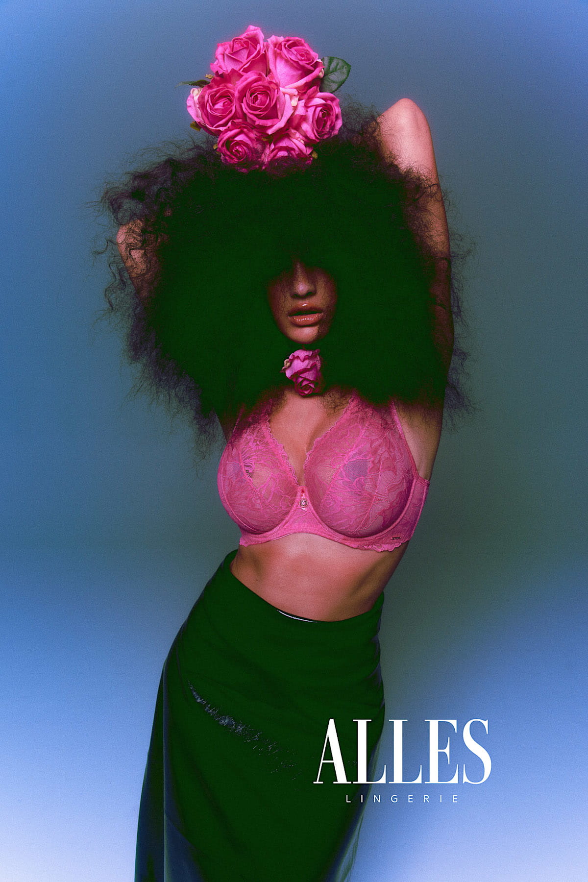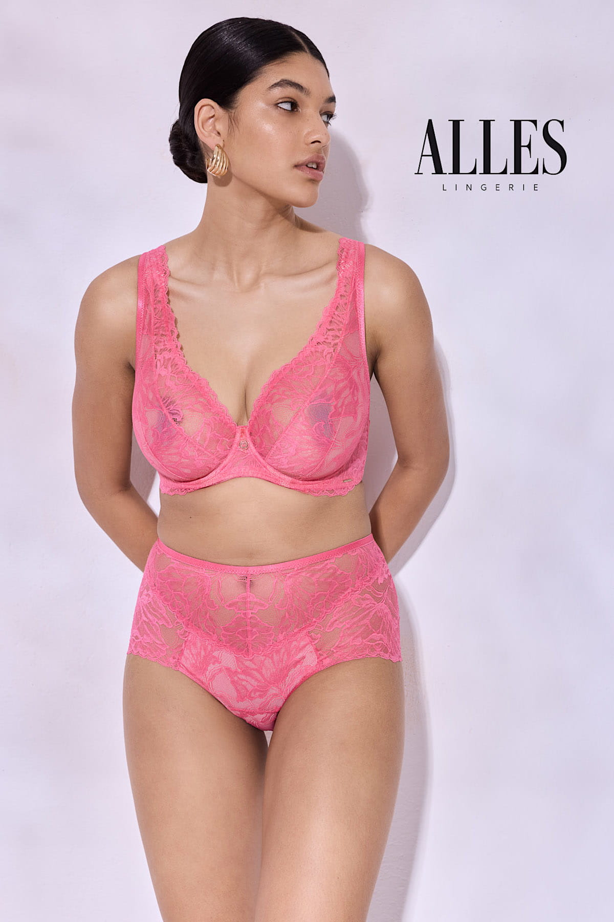 Coachella marki Alles to bezkompromisowo efektowna kolekcję bielizny, obok której nie przejdziesz obojętnie. Tropikalnie soczysty, koralowy róż i kwiecista koronka to doskonały tandem, który pięknie podkreśli letnią opaleniznę, a połyskujące różowym złotem detale rozświetlą całość. Połącz biustonosz z pasującymi figami z kolekcji Coachella, aby stworzyć stylizację zgodną z najnowszymi trendami.