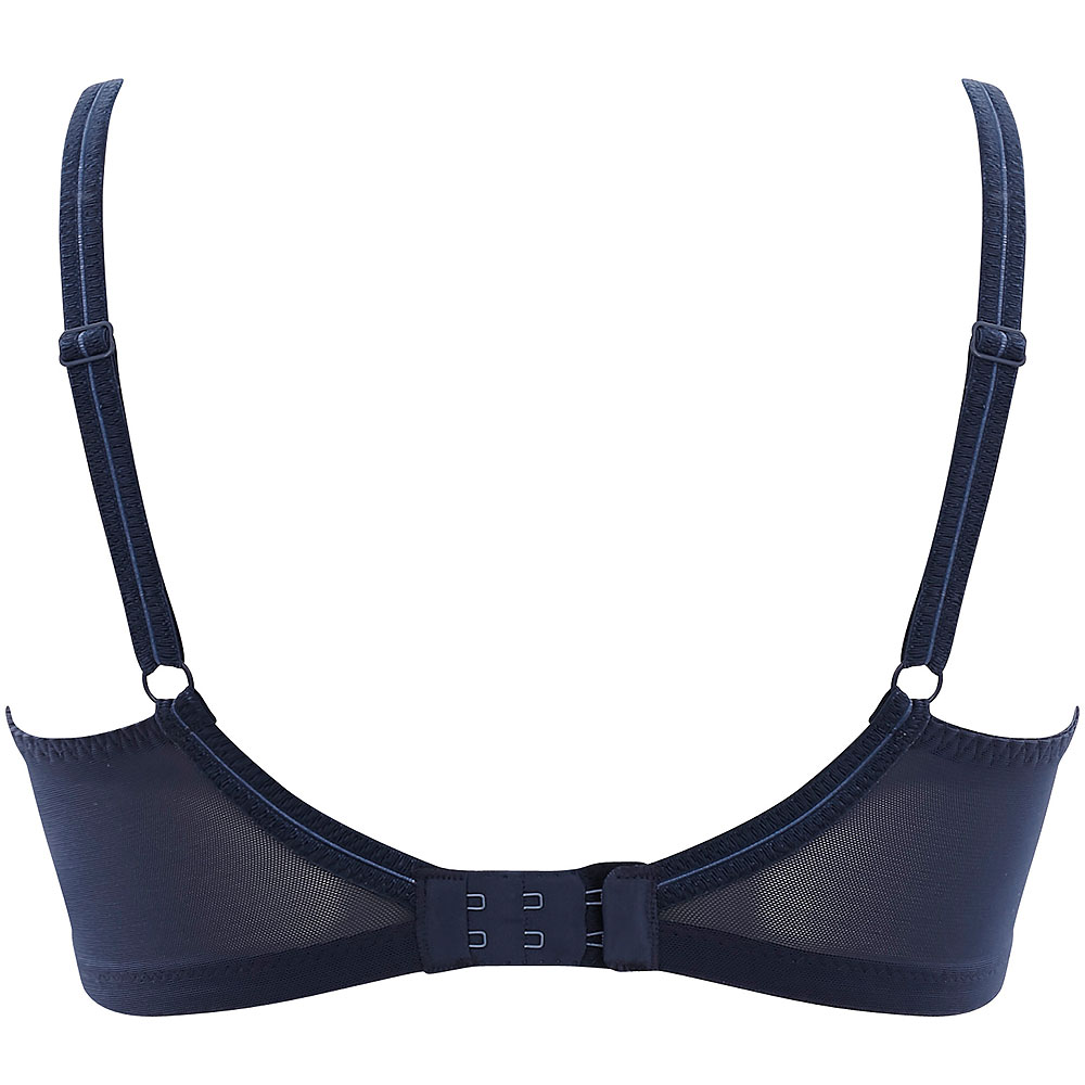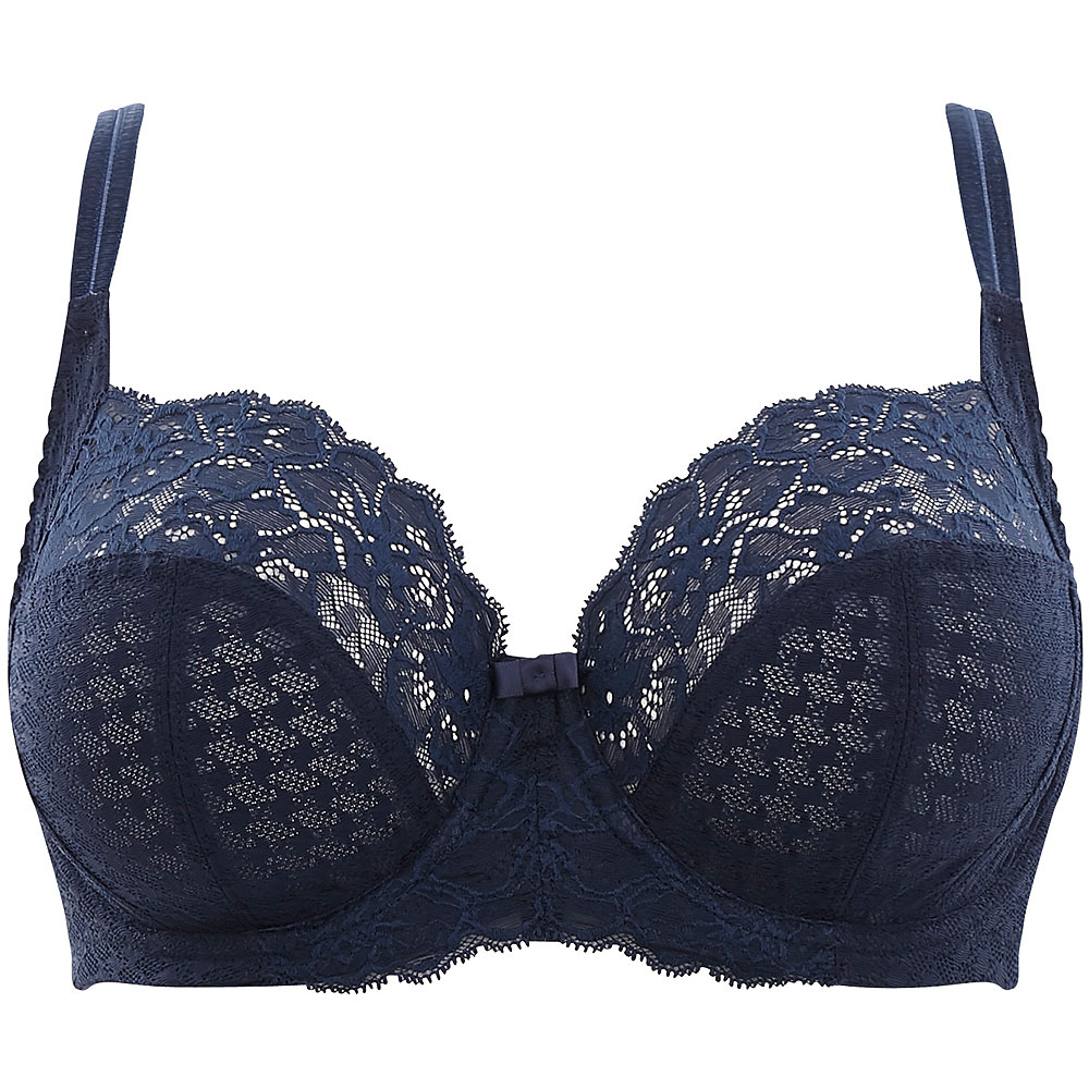 Piękny, stylowy, ponadczasowy... Biustonosz Envy zachwyca zestawieniem gładkiej koronki z dużym wzorem pepito z mięsistą, elastyczną koronką z kwiatowym motywem w górnej części miseczek i na kołysce biustonosza. Luksusowe ramiączka o misternej fakturze cieszą oko, stylowymi dodatkami są także eleganckie kokardki na mostku i przy ramiączkach. Stylowy granat nadaje Envy klasycznego uroku i dołącza do bazowych kolorów tego modelu!