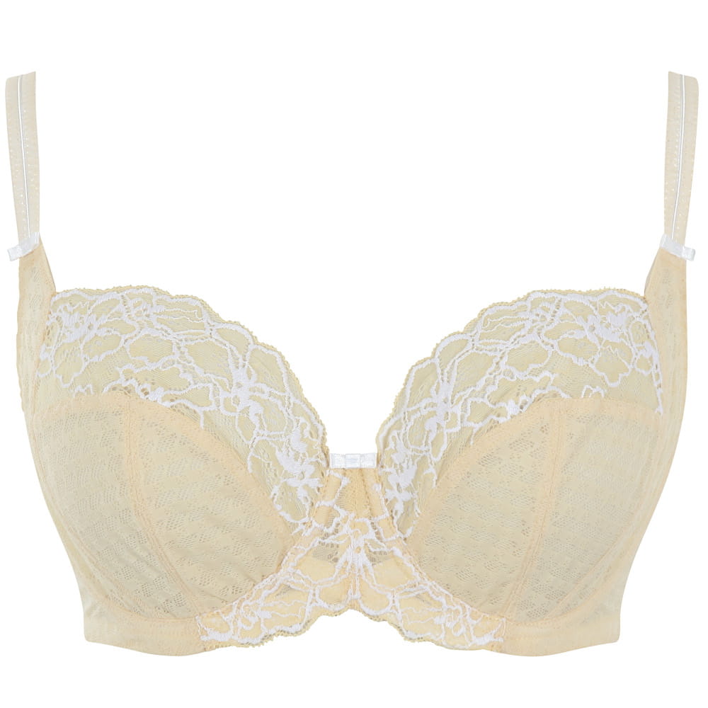 Piękny, stylowy, ponadczasowy... Biustonosz Envy zachwyca zestawieniem gładkiej koronki z dużym wzorem pepito z mięsistą, elastyczną koronką z kwiatowym motywem w górnej części miseczek i na kołysce biustonosza. Luksusowe ramiączka o misternej fakturze cieszą oko. Stylowymi dodatkami są także eleganckie kokardki na mostku i przy ramiączkach. Envy w radosnym, pastelowym odcieniu żółci z białymi akcentami może z powodzeniem zastąpić w letnich stylizacjach klasycznie beżową bieliznę.
