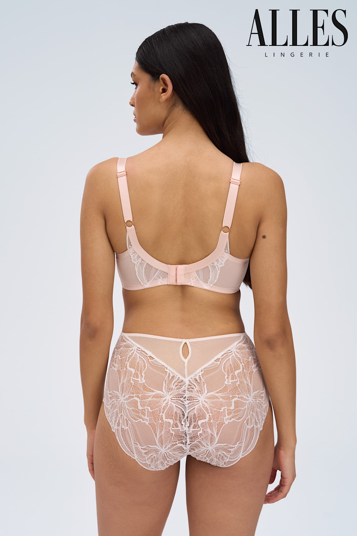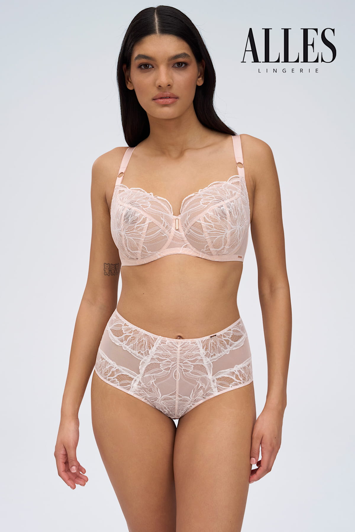 Kwiatowy wzór koronki w kolorze kremu, poprzeplatany perłowymi akcentami, okraszony pudrową bazą czyni ten model subtelnym i romantycznym. Dodatki w kolorze różowego złota wprowadzają biżuteryjny blask. Kolor sprawdzi się idealnie pod jasne stylizacje, a płaski splot koronki zapewnia niewidoczność pod ubraniem, czyniąc ją idealnym wyborem na każdą okazję.