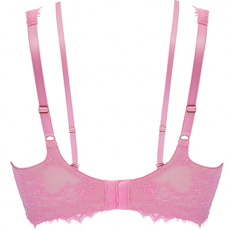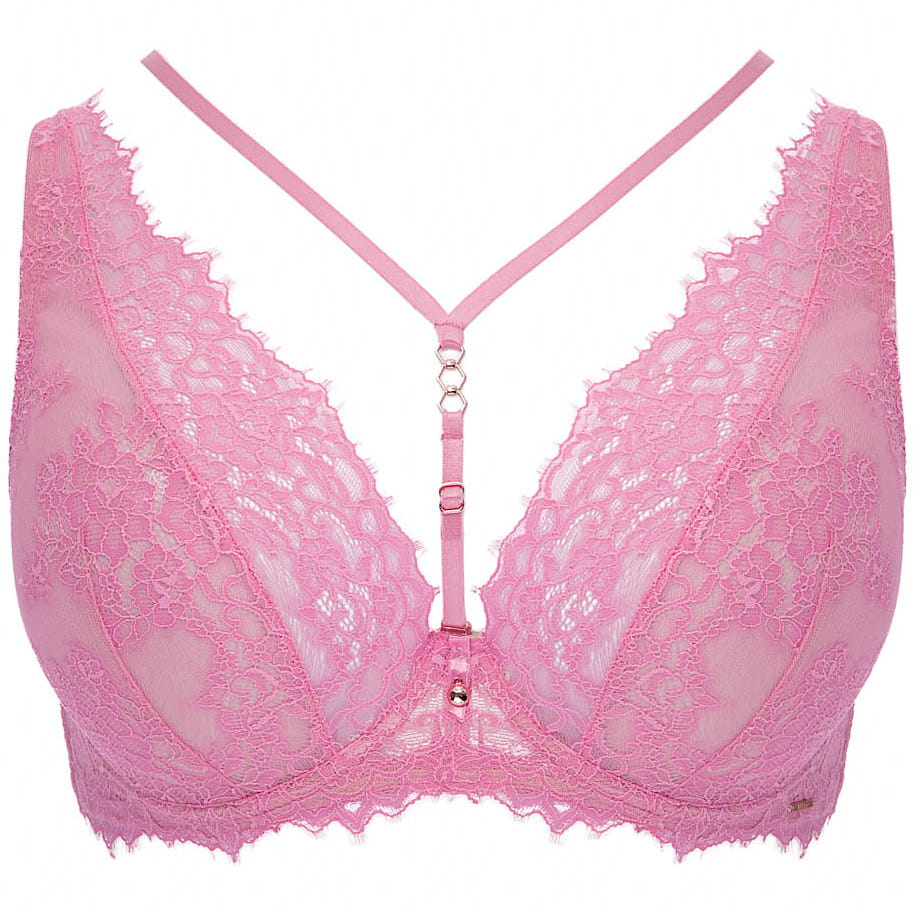 Braletka w odcieniach różu z kolekcji French Kiss została wykonana z bogato zdobionej koronki, której brzeg wykończony jest delikatnymi „rzęskami”. Całość dopełniają złoto- różowe, metalowe dodatki. Biustonosz French Kiss M Bralette posiada niski mostek a także zapewnia wygodę, dobre podtrzymanie biustu oraz jego efektowne wymodelowanie. Górna część koronki przedłuża się ku górze zdobiąc dekolt i ramiona, a dopinany straps z ozdobnym elementem biżuteryjnym nadają modelowi wyjątkowego, modowego charakteru.
