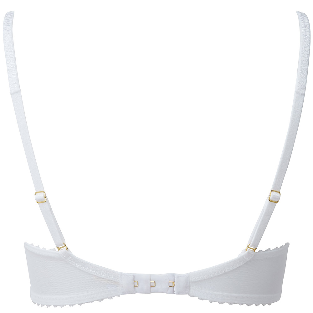 Gypsy High Apex to jedna z najnowszych konstrukcji marki Gossard. Model o delikatnie usztywnianych miseczkach, ciętych z trzech części pokryto elegancką koronką w kolorze białym. Zastosowana konstrukcja (krój plunge) sprawia, że biust jest mocno zebrany i uniesiony. Na mostku kokardka oraz pięknie błyszcząca literka "G". Tył pasa obwody wykonano z półprzejrzystej siateczki.