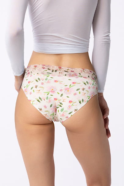 Hipstery wykończone u góry koronką delikatnie okalają biodra, prezentując kobiecy i zmysłowy krój. Dedykowane dla Pań, które cenią swobodę i wygodę bez żadnych ograniczeń. Majtki z koronkowym wykończeniem w kobiecym wzorze Jasmine Hipster Hiphuggers to połączenie wygody, prostoty i subtelności.