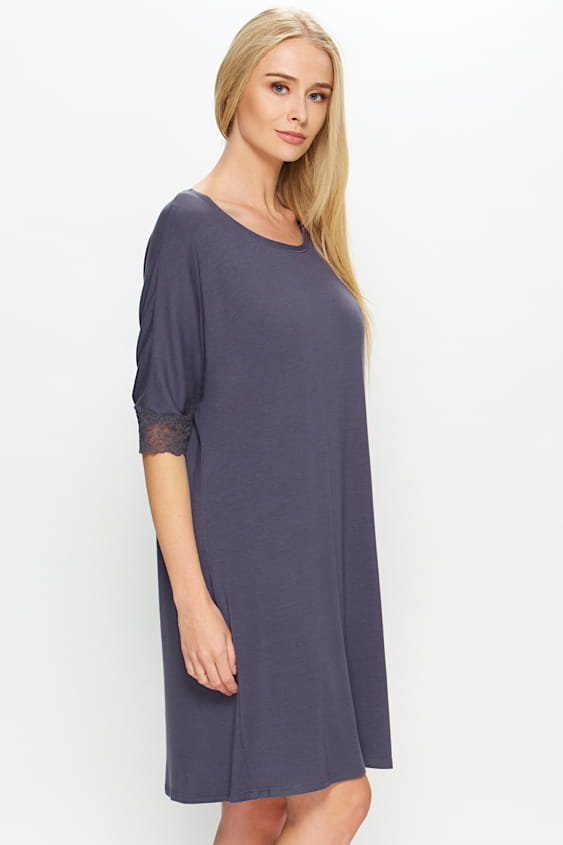 Klasyczna w kroju koszulka nocna w całości wykonana z gładkiego i niezwykle miękkiego modalu. Minimalistyczną formę koszulki przełamano delikatnymi koronkowymi wstawkami na brzegu rękawów.