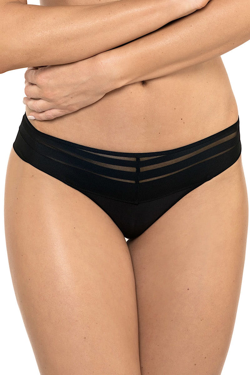 Nietuzinkowe stringi wykonane z miękkiej dzianiny ozdobionej nowoczesnymi paskami. Bawełniana wyściółka w środku zagwarantuje wygodę i komfort noszenia.
