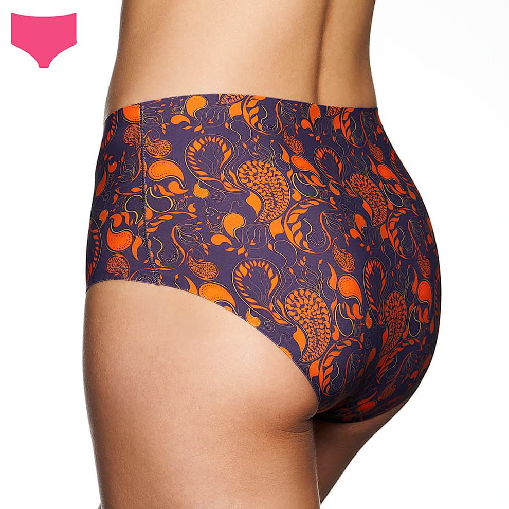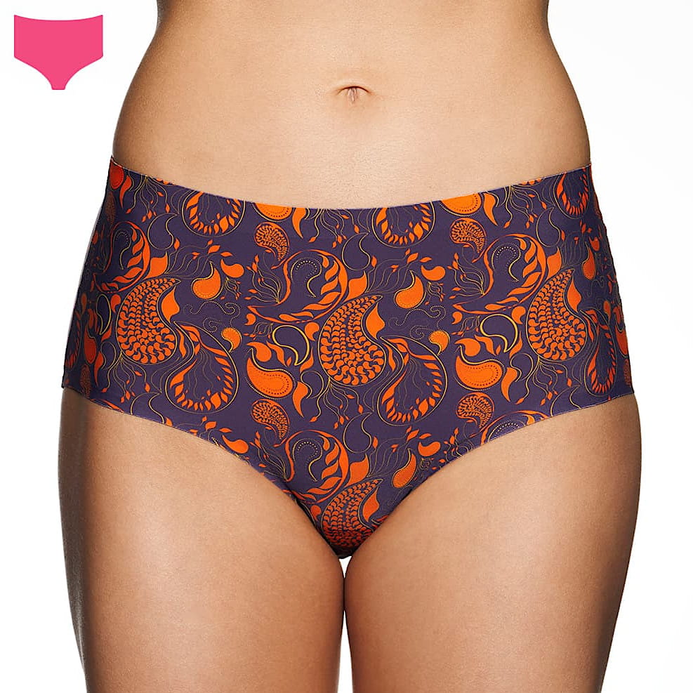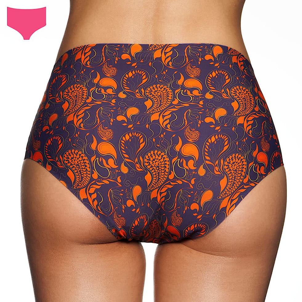 Elastyczne, bezszwowe figi z energetycznym printem. Power fern w abstrakcyjne wzorzyste paprocie w kontrastującym z tłem pomarańczem z którego bije tajemnicza kobieca energia. Figi z nasyconym i wyrazistym nadrukiem wykonanym specjalną, trwałą techniką. Delikatne klejenie na krawędziach, które zapobiega odznaczaniu się majtek pod ubraniem, a szerokie klejenie na linii pasa dające efekt wyszczuplenia. Szew z elastycznej przędzy. Ekologiczny hot stamping zamiast metki. Bawełniana wkładka w środku fig.