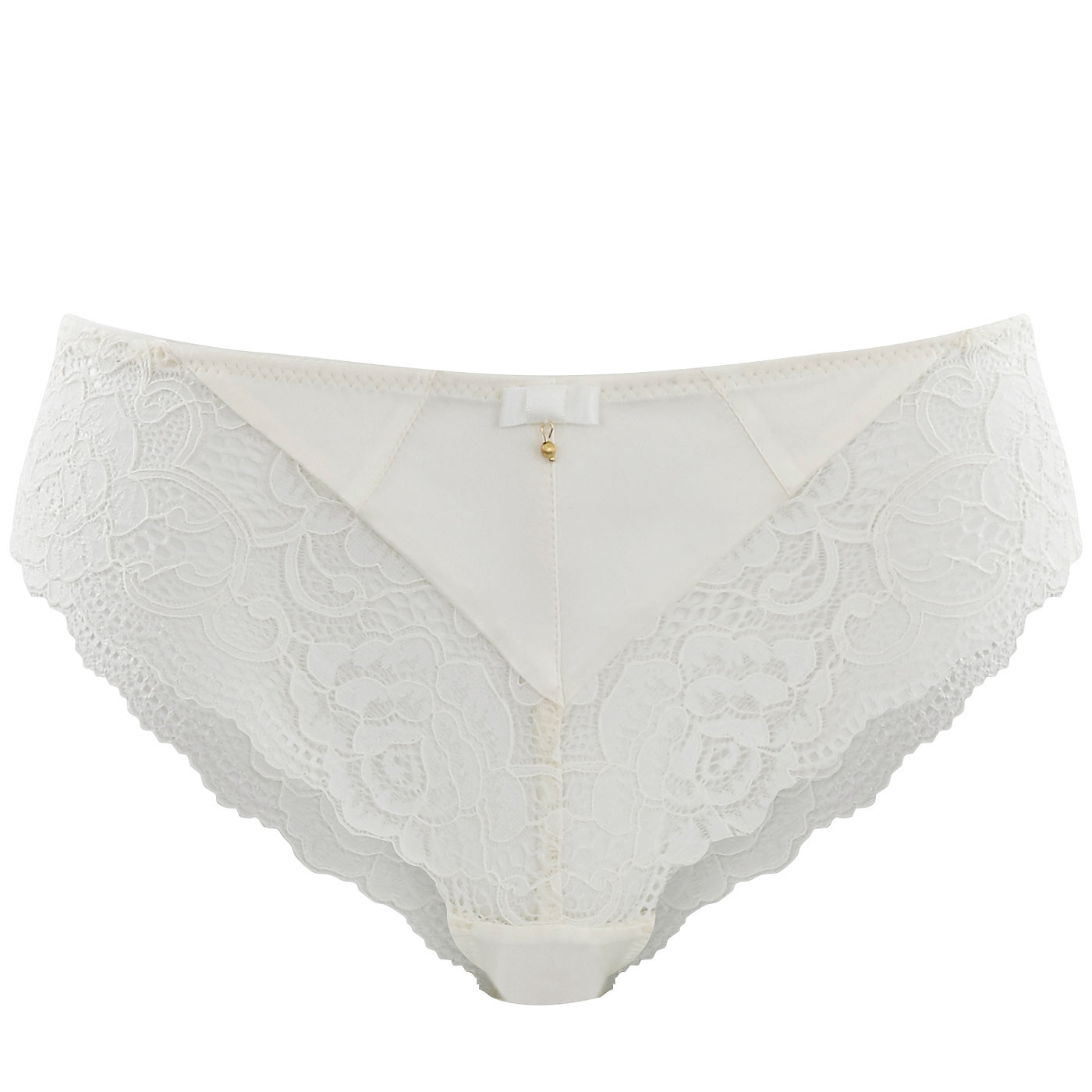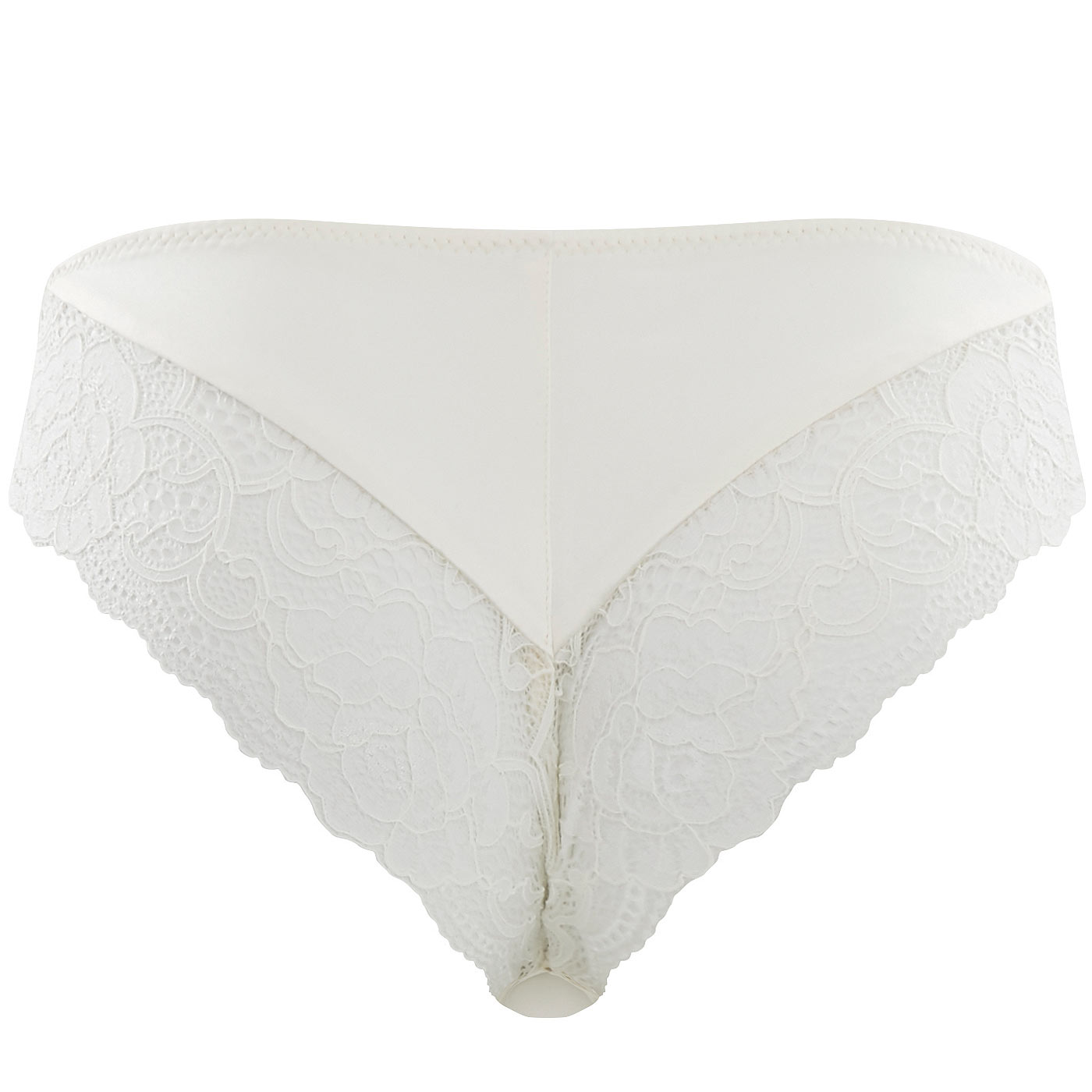 Figi o kroju brazylijskim z kolekcji ślubnej Quinn od Panache Black. Niezwykle delikatną satynę zestawiono z francuską koronką w kremowym kolorze. Dopełnieniem całości jest satynowa kokardką z malutką złotą zawieszką.