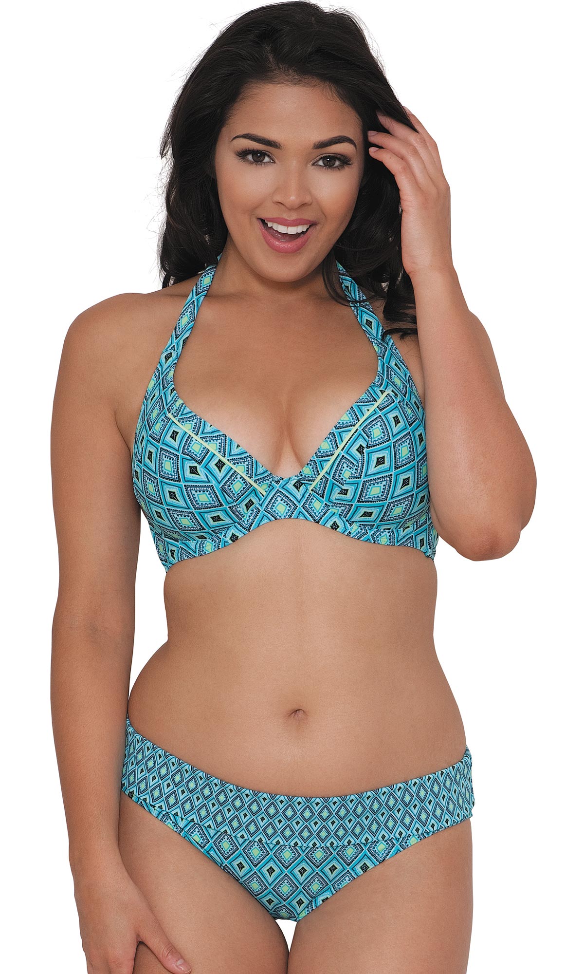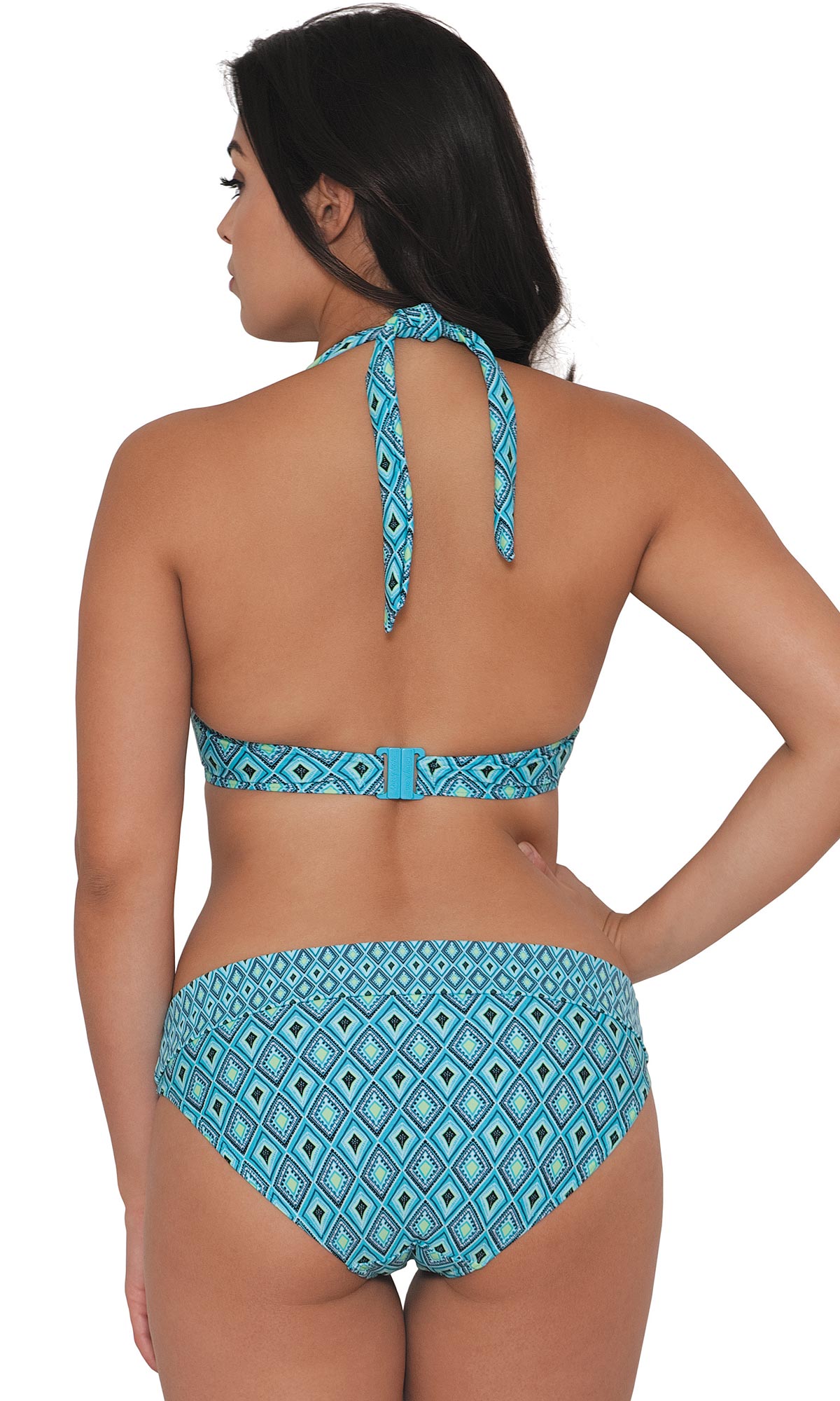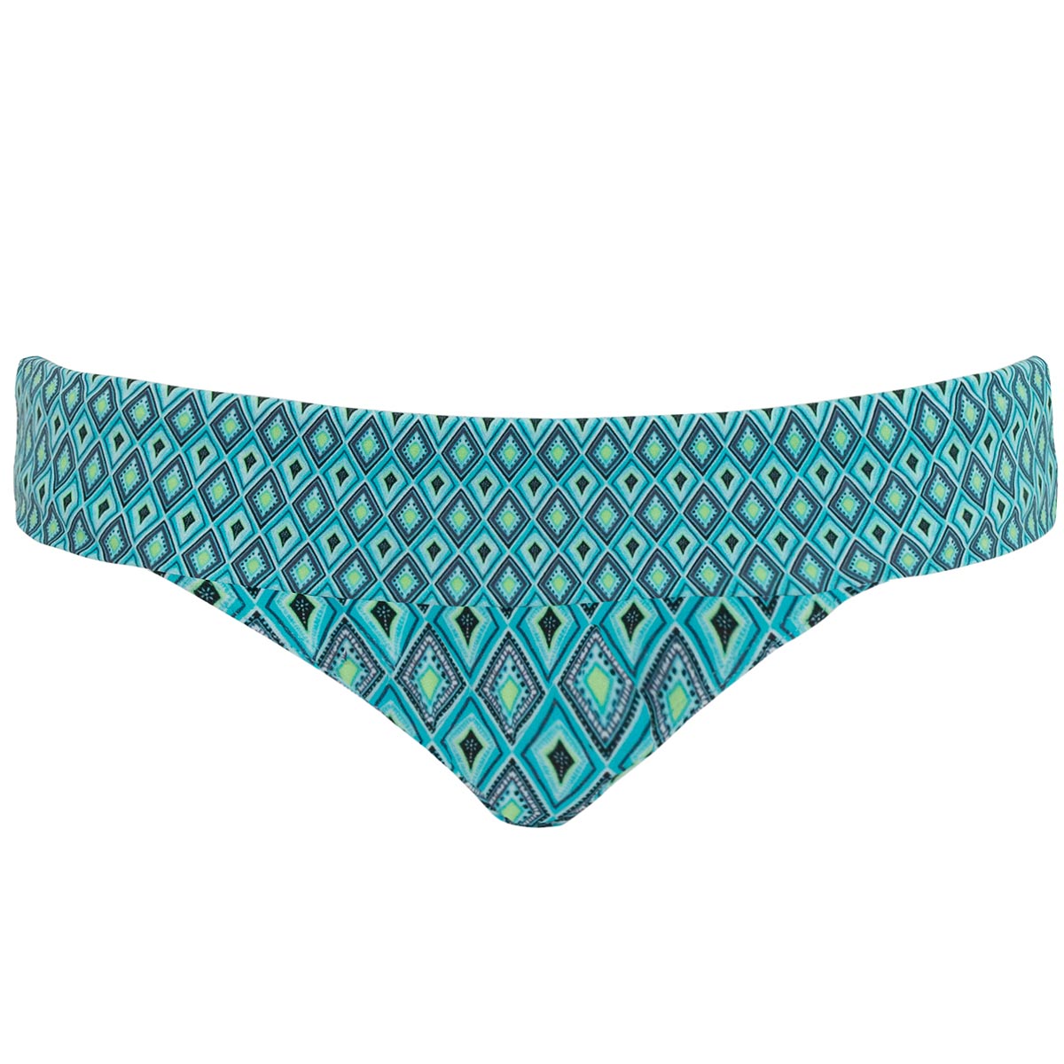 Klasyczne w kroju figi z zakładką zadrukowane w geometryczny wzór. Zaletą zakładki jest możliwość dostosowania fig do Twoich potrzeb - w łatwy sposób zamaskujesz dolną partie brzucha lub po jej obniżeniu, zakryjesz pełniejsze biodra.