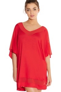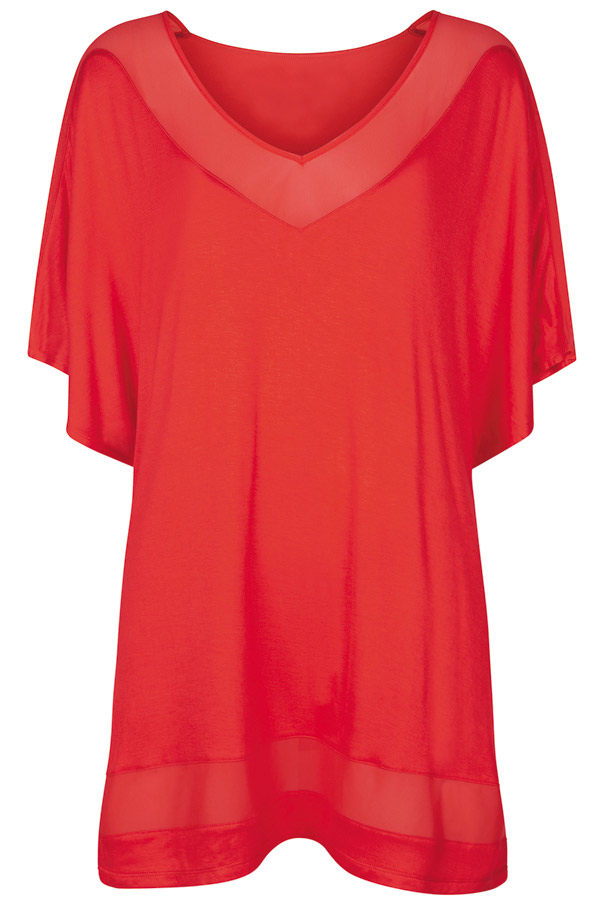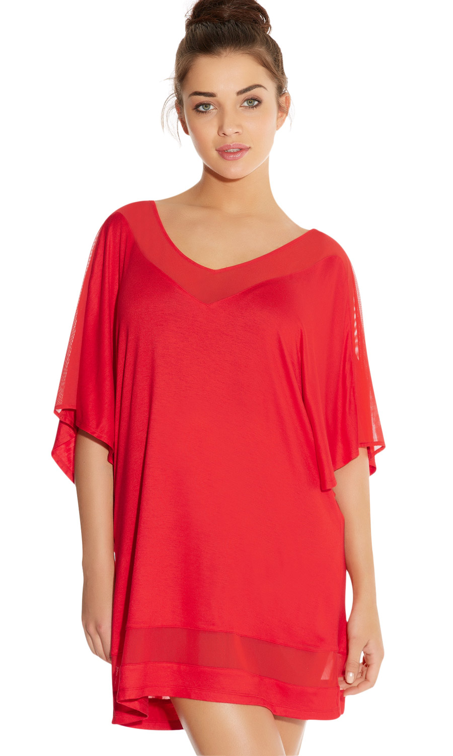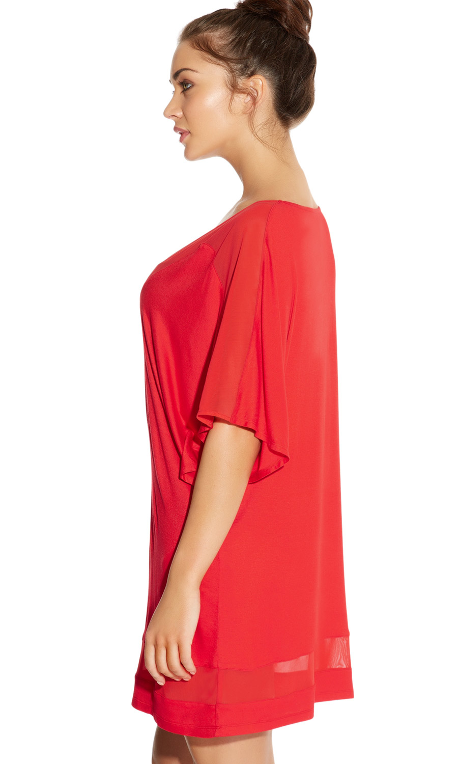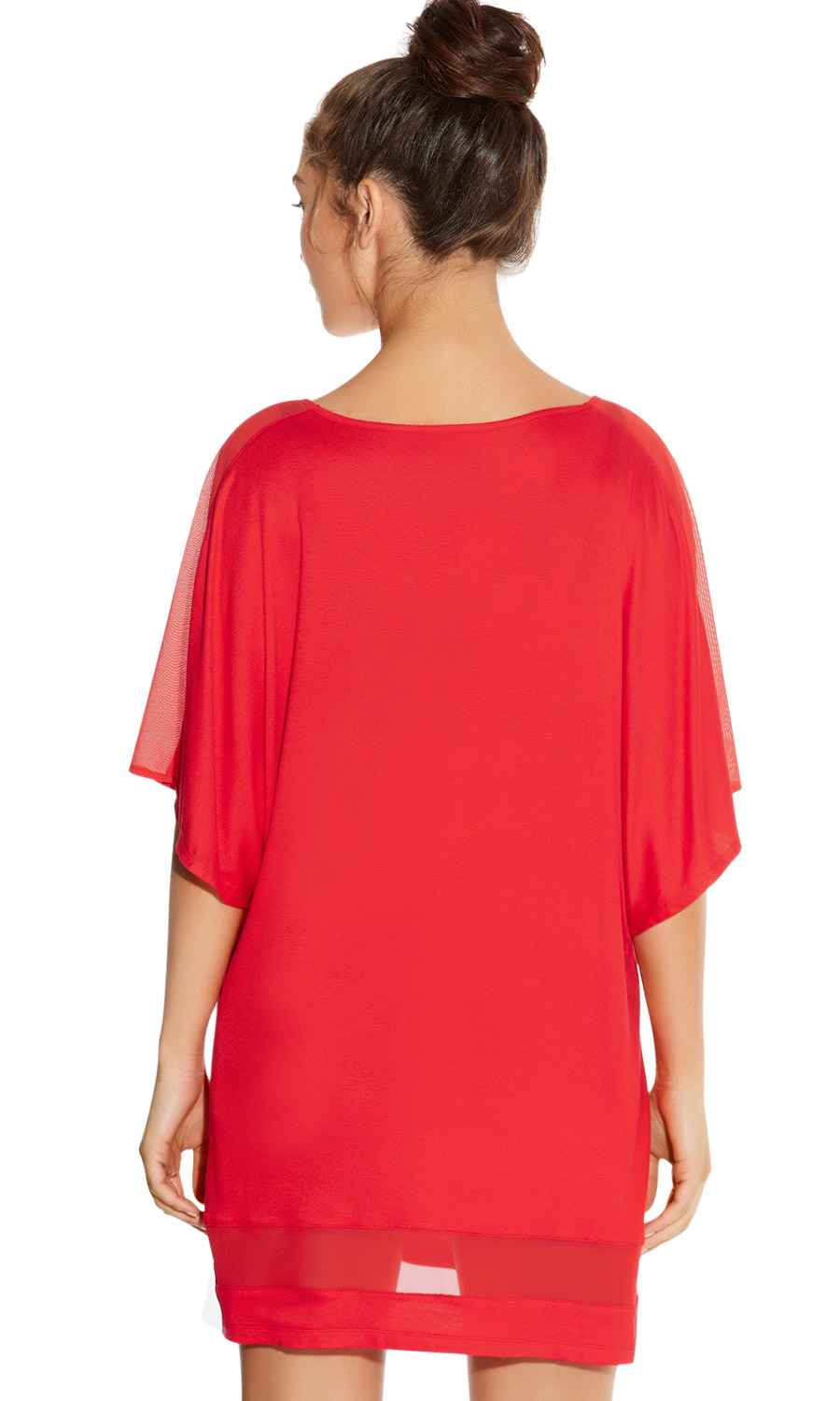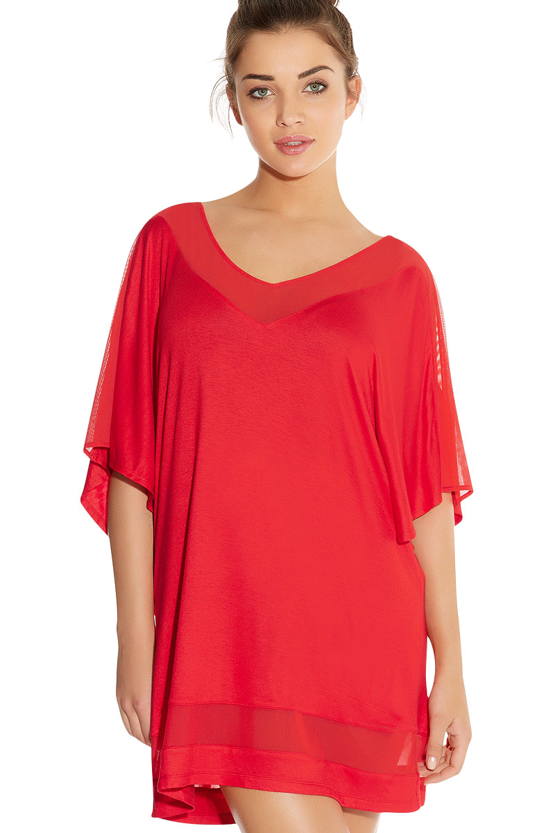 Efektowna tunika plażowa wykonana ze zwiewnego materiału w kolorze czerwonym. Linię dekoltu oraz dolną krawędź tuniki ozdobiono wstawkami z czerwonej, przejrzystej siateczki.