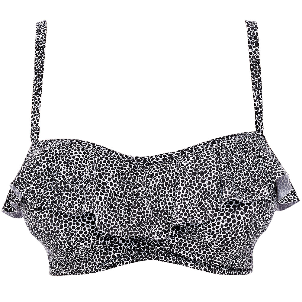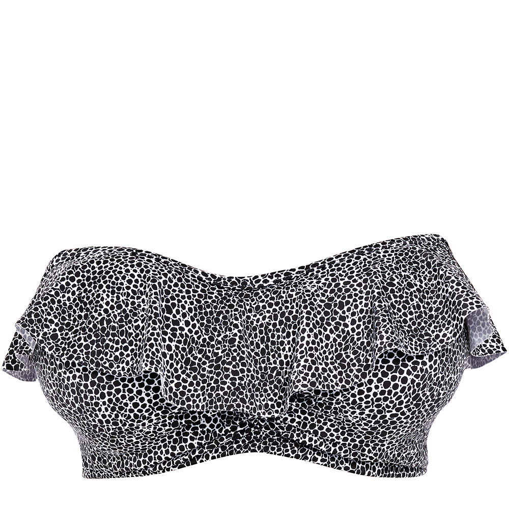 Run Wild bandeau posiada miseczki usztywnione delikatną pianką. Ich zewnętrzną część pokryto elastycznym materiałem pokrytym nadrukiem w drobne, czarne cętki. Naszyta na górnej krawędzi falbanka dodaje lekkości oraz podkreśli kształt biustu i nie pozwoli przejść obok Ciebie obojętnie.
