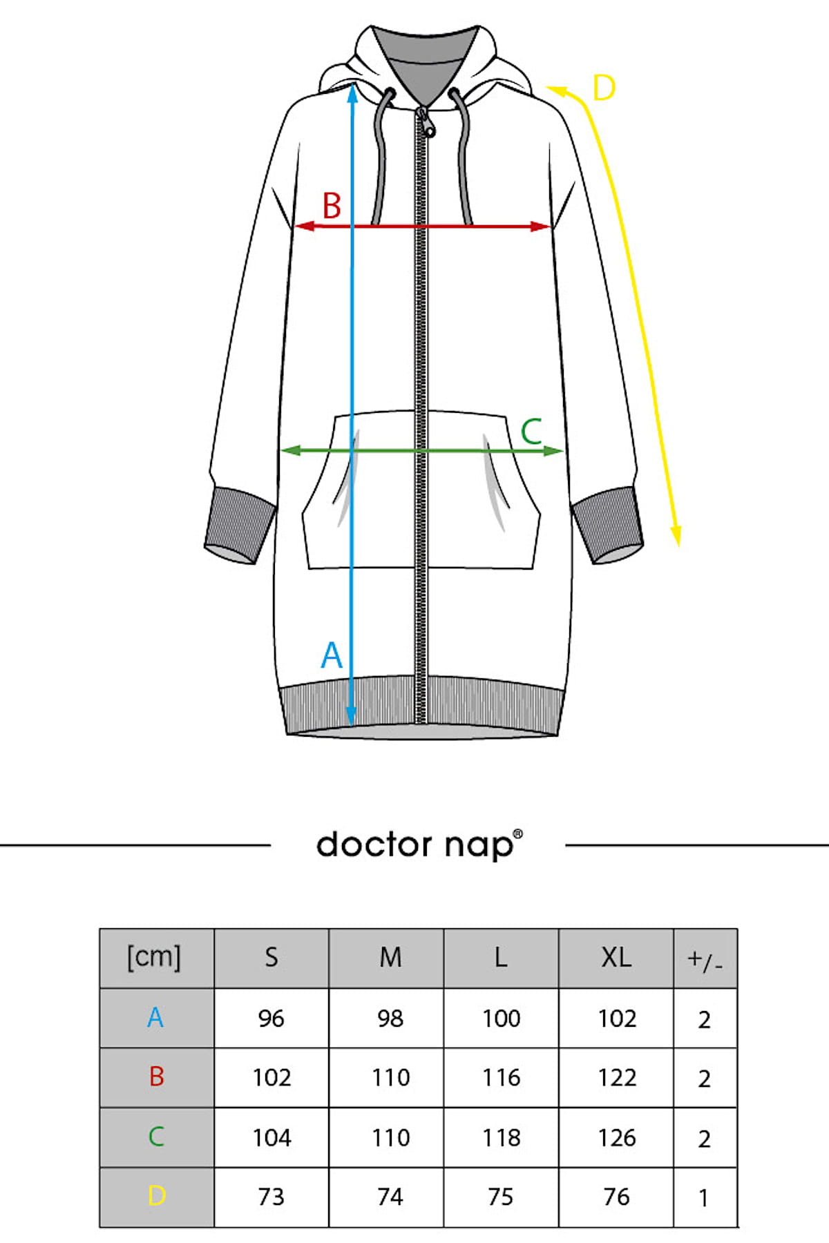 Szlafrok rozpinany na zamek błyskawiczny, z funkcjonalnymi kieszeniami i kapturem. Ponadczasowy krój, praktyczny o każdej porze dnia i nocy. Idealny jako homewear, wygodny i komfortowy, może służyć jako bluza - w chwili relaksu przy porannej kawie bądź na spacerze. Kaptur wykończony taśmami z logo Doctor Nap. Fason i wzornictwo zaspokoi najbardziej wymagającego klienta.