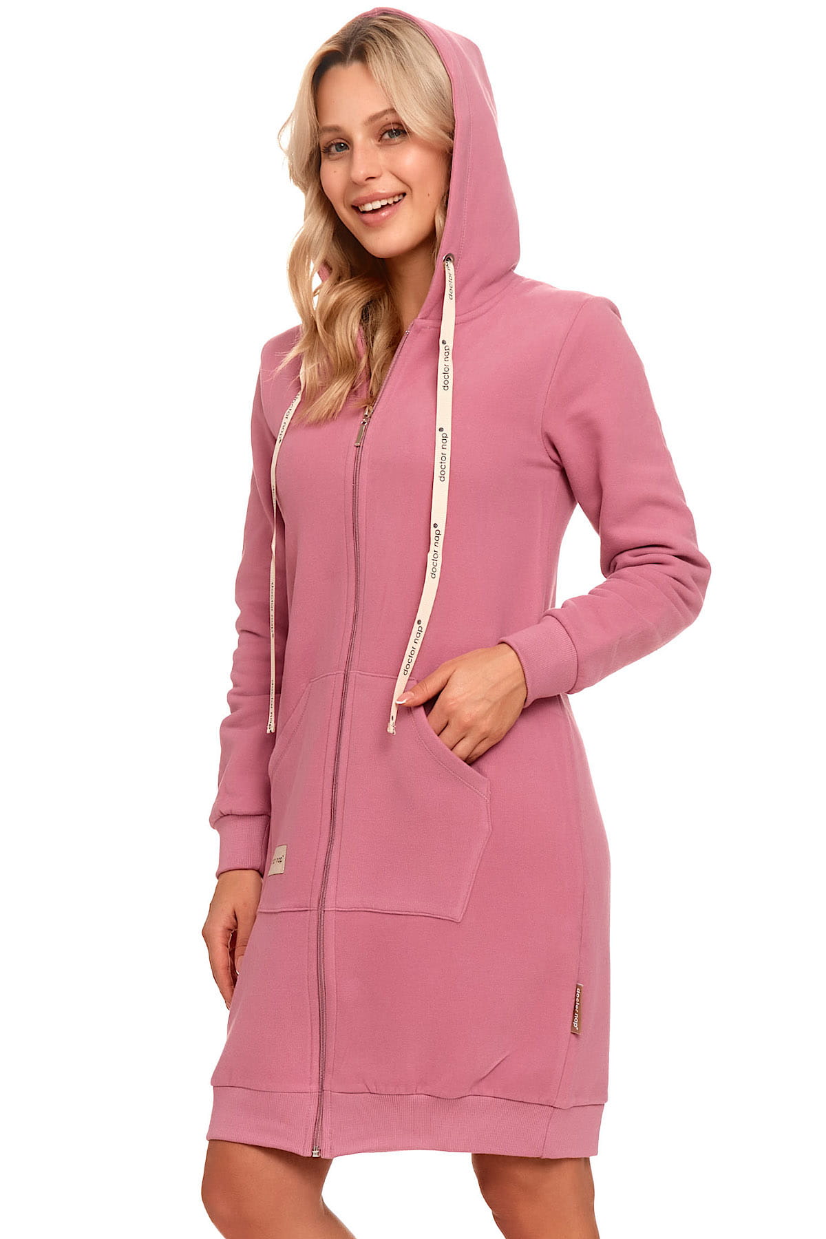 Szlafrok rozpinany na zamek błyskawiczny, z funkcjonalnymi kieszeniami i kapturem. Ponadczasowy krój, praktyczny o każdej porze dnia i nocy. Idealny jako homewear, wygodny i komfortowy, może służyć jako bluza - w chwili relaksu przy porannej kawie bądź na spacerze. Kaptur wykończony taśmami z logo Doctor Nap. Fason i wzornictwo zaspokoi najbardziej wymagającego klienta.