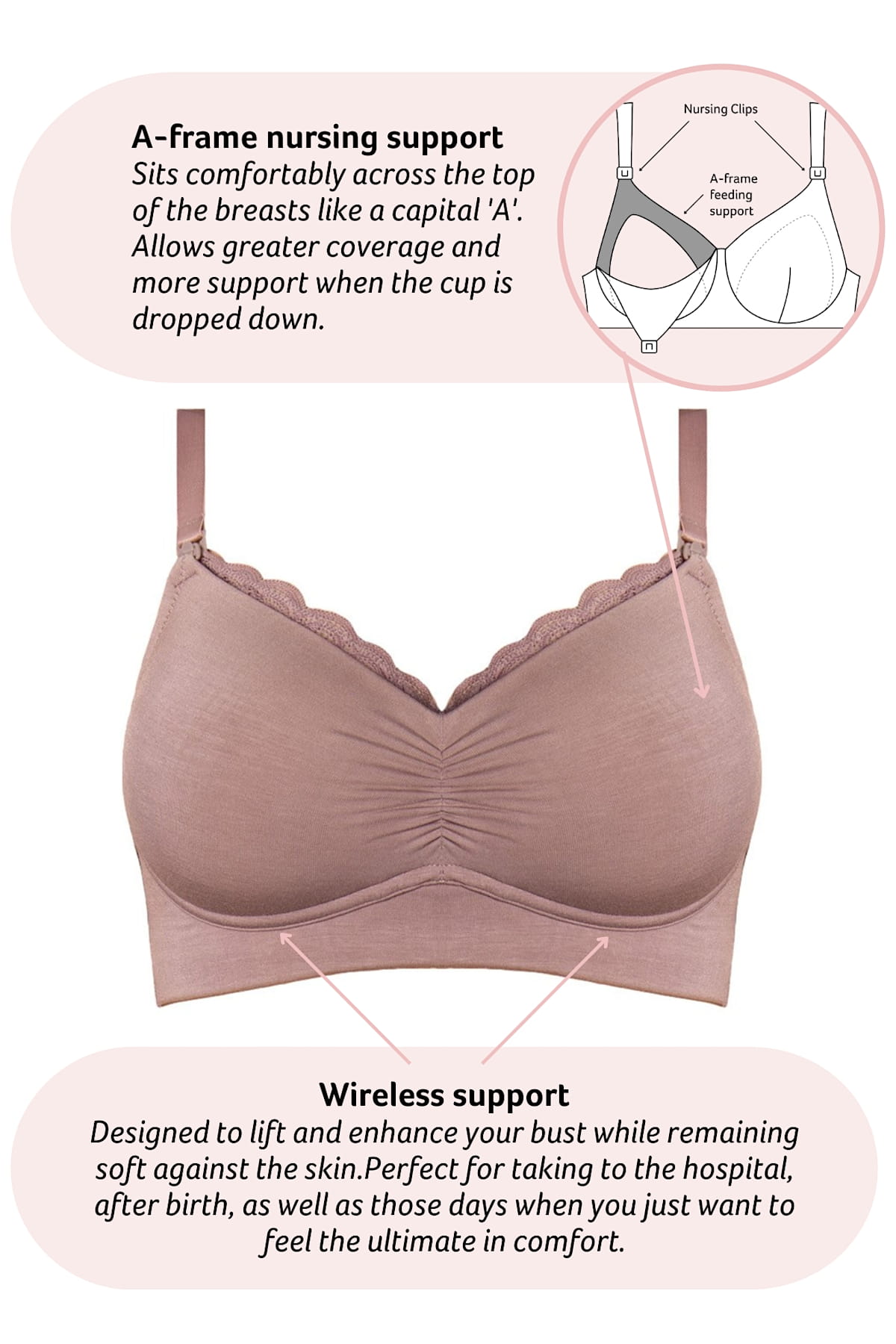 Miseczki są odpinane przy pomocy plastikowych klipsów. Ramiączka są zabezpieczone przed odskakiwaniem na plecy specjalnym klinem z dzianiny, wszytym wewnątrz miseczki. Sześciostopniowa regulacja zapięcia i regulowane ramiączka pozwalają dopasować biustonosz do zmieniającego się ciała.