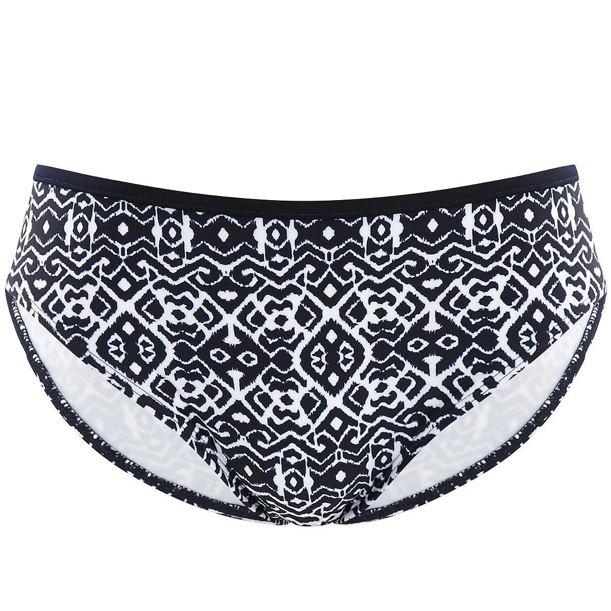 Klasyczne w kroju figi wykonane z elastycznego materiału z etnicznym wzorem w kolorze granatowo-białym. Figi podszyto dodatkową warstwą materiału, która zapobiega nadmiernemu rozciąganiu się fig pod wpływem wody.