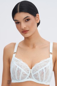 Fason zapewnia komfort noszenia przez cały dzień, oferując odpowiednie podtrzymanie również przy pełniejszych sylwetkach, bez rezygnacji z lekkości formy. Soft Blur M podkreśla kobiece proporcje w subtelny, wyważony sposób, wpisując się w nowoczesne podejście do bielizny – świadome, funkcjonalne i jednocześnie wyrafinowane. Biustonosz Soft Blur M w chłodnej, lodowej mięcie wpisuje się w estetykę quiet luxury i nowoczesnego minimalizmu, w której forma opiera się na lekkości, precyzji i pracy światła. Subtelny odcień porządkuje całość, zamiast ją dominować, podkreślając spójność i wyważony charakter projektu. Koronka przepleciona lureksową nicią, wprowadza delikatny, zmienny połysk — światło miękko osiada na strukturze materiału, nadając jej głębi i dynamiki. Złote detale pełnią rolę eleganckiego akcentu, dopełniając całość biżuteryjnym wykończeniem. Konstrukcja pozostaje funkcjonalna i komfortowa, a jednocześnie dopracowana w każdym detalu. Soft Blur M to model, w którym kluczowe znaczenie mają proporcje, faktura i subtelność wyrazu — tworząc nowoczesną, spokojną interpretację kobiecej bielizny. Zestaw biustonosz z figami Soft Blur i postaw na komplet, w którym forma i kolor pozostają w idealnej równowadze.