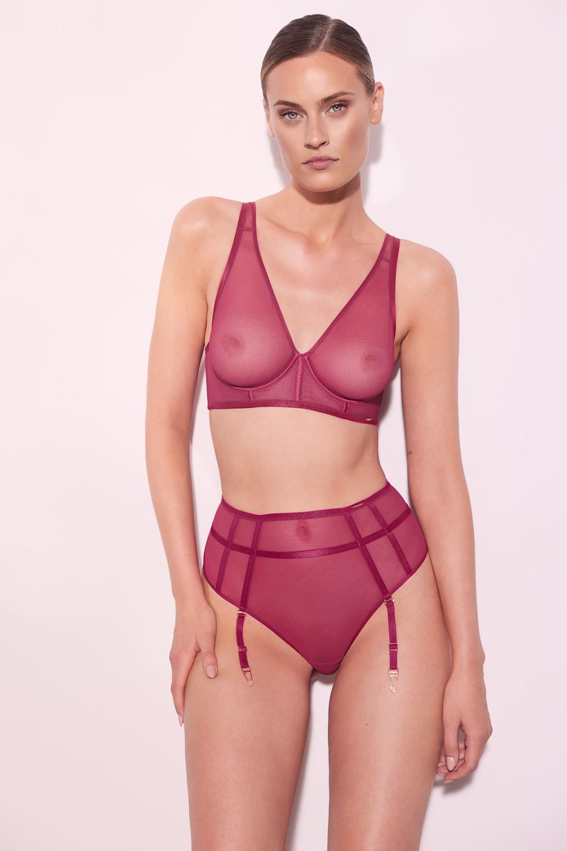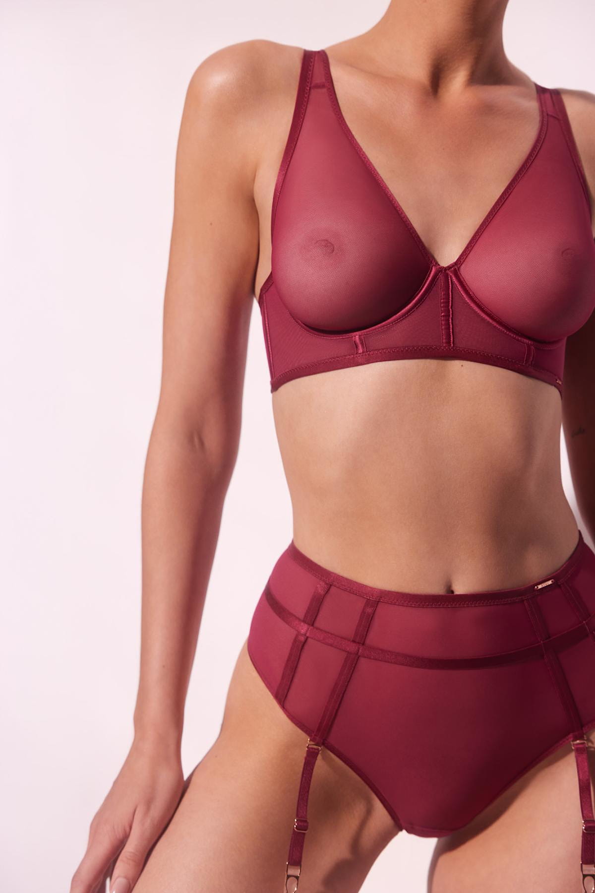 Fuksjowy transparentny biustonosz Sono M Soft Bra rozbudzi Twoją wyobraźnię. Jego wyjątkowy krój typu longline oraz termicznie tłoczone miseczki sprawiają, że jest bardzo wygodny i pięknie układa się na ciele. Model Sono M Soft Bra został wykonany z przeźroczystego, czarnego tiulu, podkreślonego satynowymi wykończeniami i złotymi dodatkami. Biustonosz jest kwintesencją nowoczesności, a design idzie w parze z komfortem użytkowania. Połącz Sono M Soft Bra ze stringami z wysokim stanem aby stworzyć zmysłową i nowoczesną stylizację.