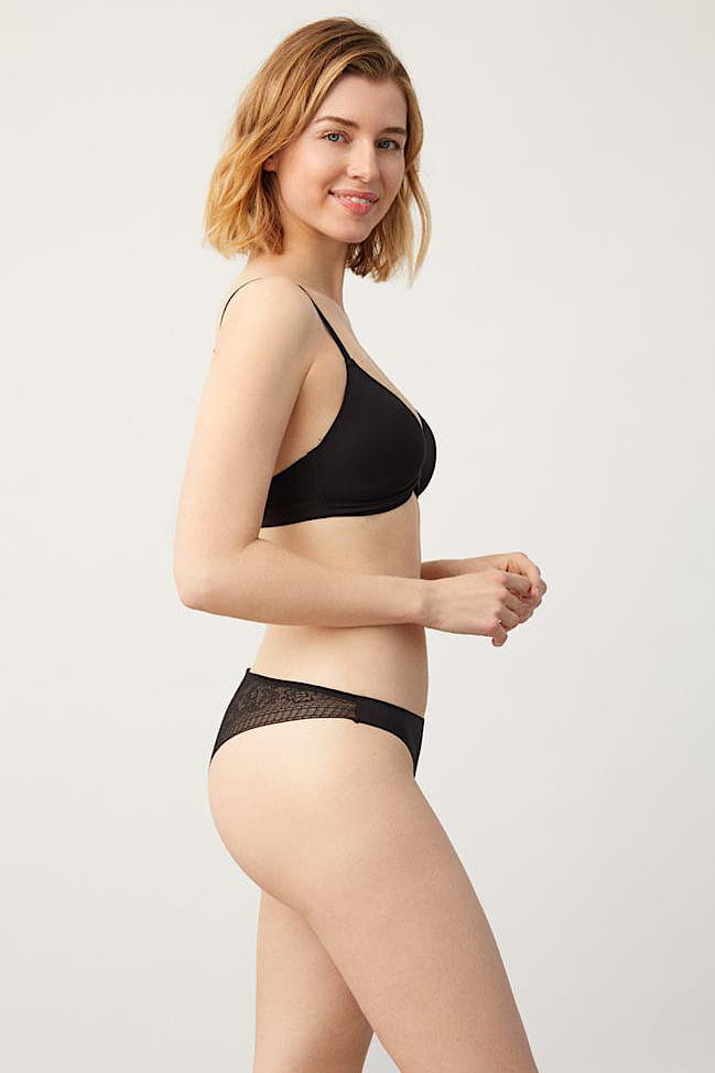 Figi o kroju brazylijskim, z niższym stanem. Tył z gładkiej, półprzejrzystej koronki wykończony bezszwowo - nie będzie odznaczał się nawet pod bardzo obcisłymi ubraniami. Przód wykonany z gładkiej dzianiny.
