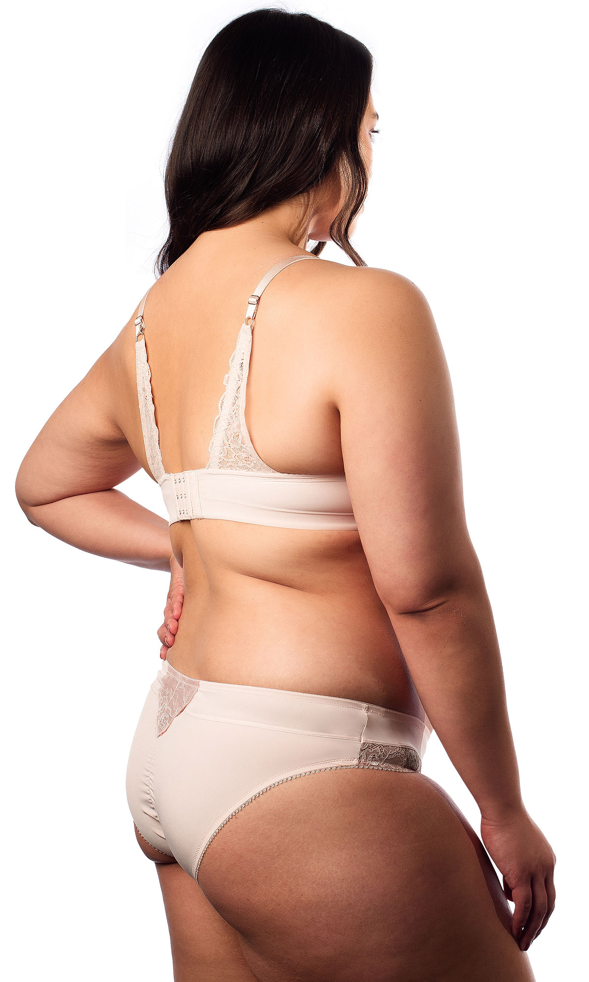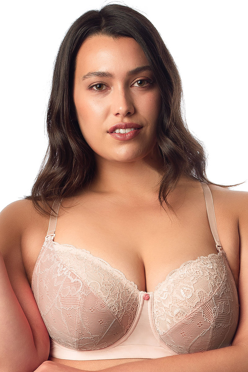 Temptation to biustonosz o miękkich miseczkach wyprofilowanych lekko elastyczną fiszbiną, która jest absolutnie bezpieczna dla karmiących piersi. Miseczki wykonano z elastycznej, pudrowej koronki z kwiatowym wzorem. Ich trzyczęściowa konstrukcja zapewnia uniesienie i zaokrąglenie piersi, a także ich solidne podtrzymanie. Wnętrze miseczek wyścielono bawełnianą podszewką w kawowo-różowym kolorze.