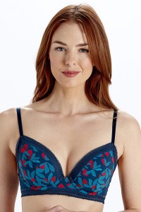 Tropic T-Shirt Bra to biustonosz z usztywnianą miseczką wyprofilowaną fiszbiną. Zewnętrzna część miseczek została pokryta dzianiną z prinetm w liście. Górną krawędź miseczek oraz pas obwodu ozdobiono płaską, koronkowa taśmą. Model dedykowany dla mniejszych biustów.